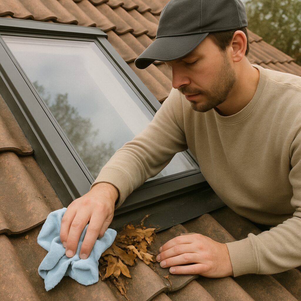 Just like gutters, the area around your roof window is a magnet for debris. When wet leaves pile up at the bottom of the unit, they form “leaf dams” that trap water against the glass, forcing moisture backward under the flashing where it doesn’t belong. Performing basic skylight maintenance twice a year—typically during your spring and fall gutter cleaning—ensures rainwater flows freely off the roof rather than pooling against critical seals.